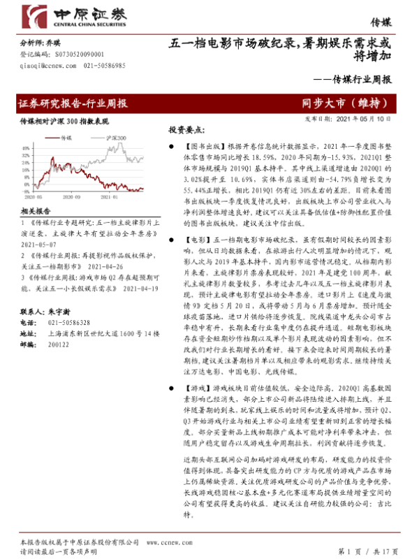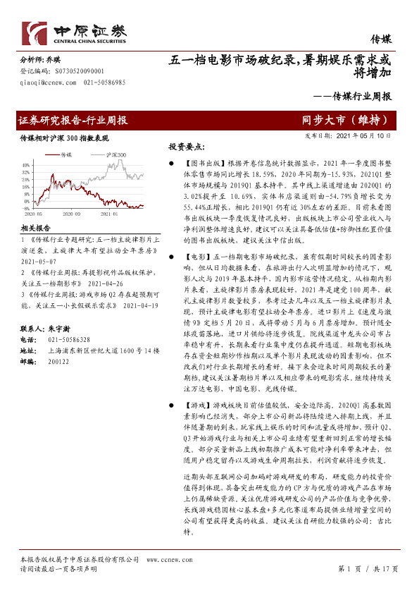 【中原证券】【20210510】传媒行业周报:五一档电影市场破纪录,暑期娱乐需求或将增加-17页