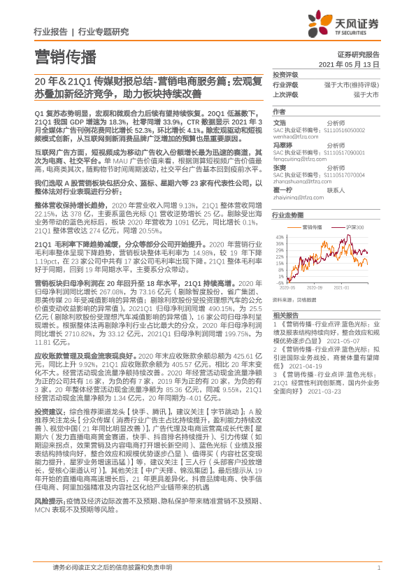 【天风证券】【20210513】20年&21Q1传媒财报总结-营销电商服务篇:宏观复苏叠加新经济竞争,助力板块持续改善-26页