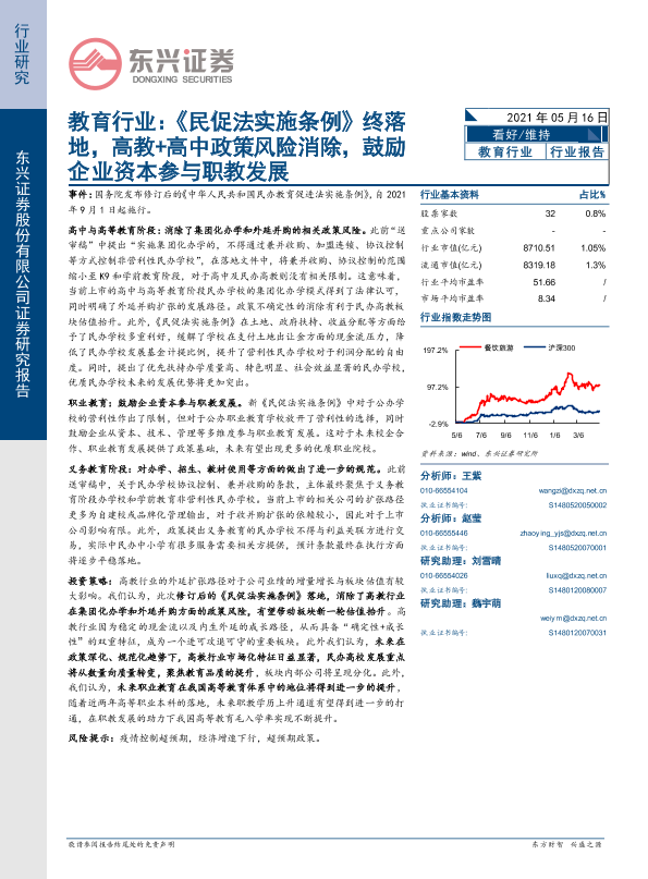 【东兴证券】【20210516】教育行业:《民促法实施条例》终落地,高教+高中政策风险消除,鼓励企业资本参与职教发展-7页