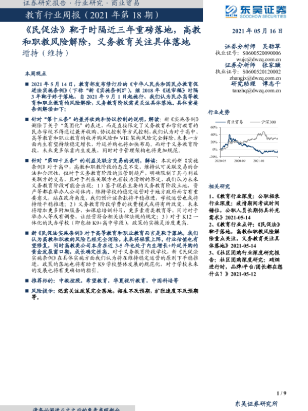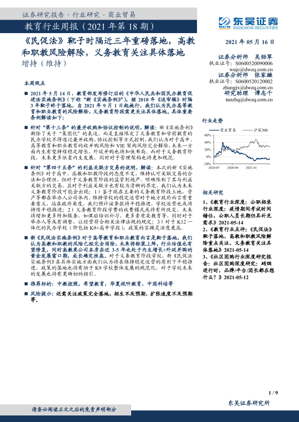 【东吴证券】【20210516】教育行业周报(2021年第18期):《民促法》靴子时隔近三年重磅落地,高教和职教风险解除,义务教育关注具体落地-9页