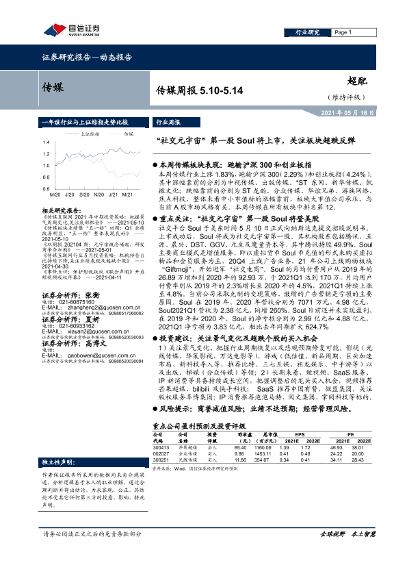 【国信证券】【20210516】20210516-国信证券-传媒周报:“社交元宇宙”第一股Soul将上市,关注板块超跌反弹-8页