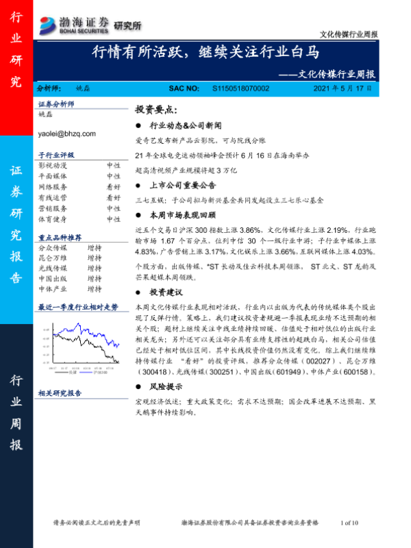 【渤海证券】【20210517】20210517-渤海证券-文化传媒行业周报:行情有所活跃,继续关注行业白马-10页
