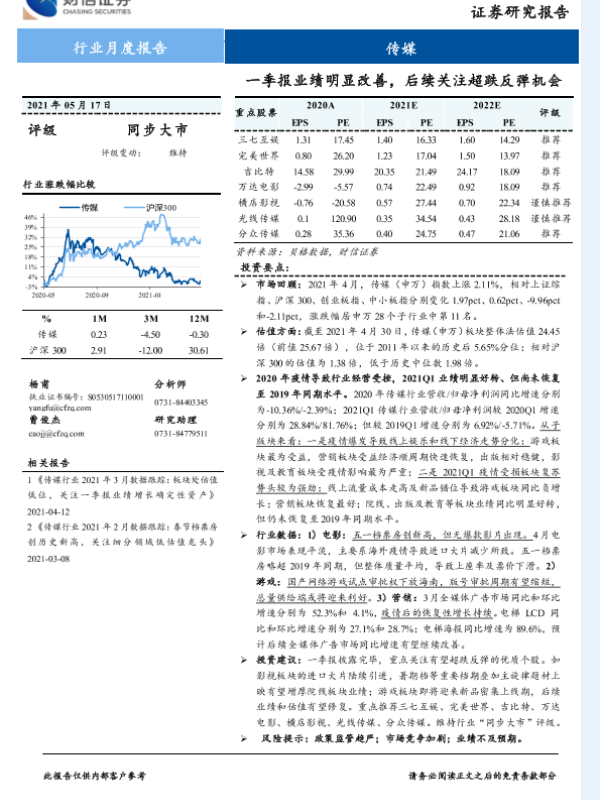 【财信证券】【20210517】20210517-财信证券-传媒行业月度报告:一季报业绩明显改善,后续关注超跌反弹机会-22页
