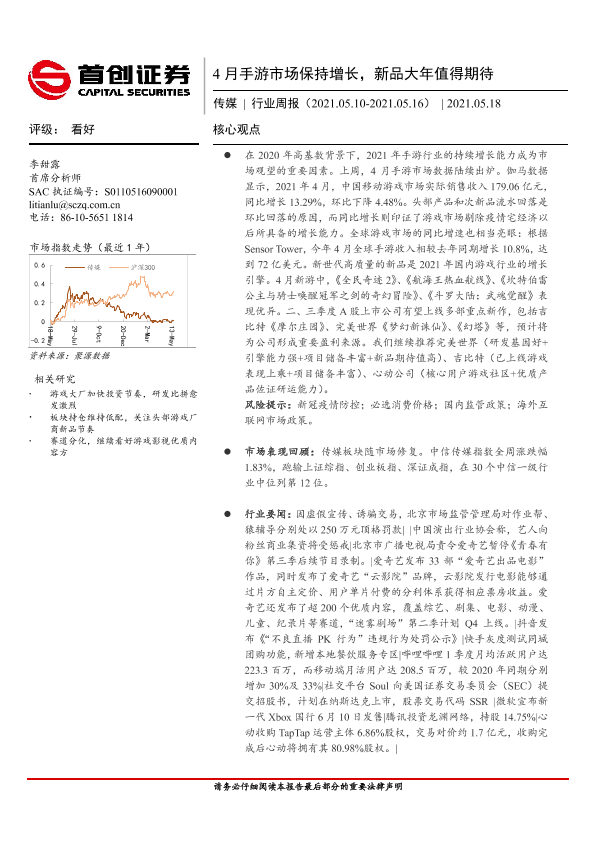 【首创证券】【20210518】20210518-首创证券-传媒行业周报:4月手游市场保持增长,新品大年值得期待-12页