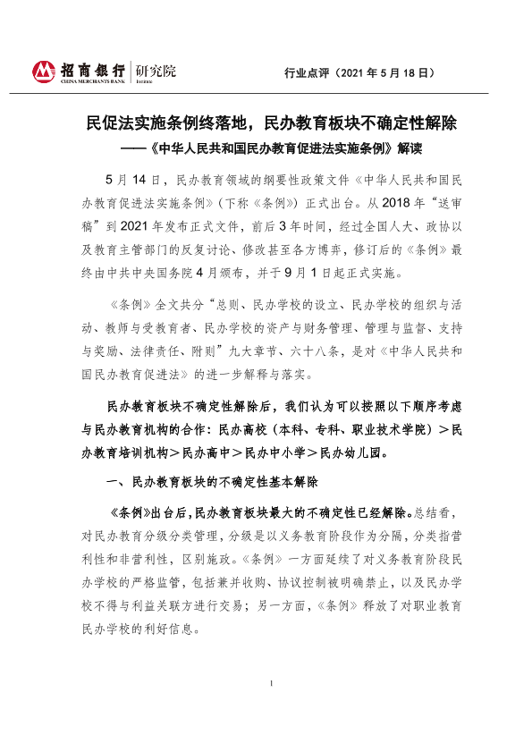 【招商银行】【20210518】《中华人民共和国民办教育促进法实施条例》解读:民促法实施条例终落地,民办教育板块不确定性解除-4页