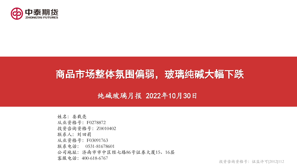 【中泰期货】【20221030】纯碱玻璃月报:商品市场整体氛围偏弱,玻璃纯碱大幅下跌-25页