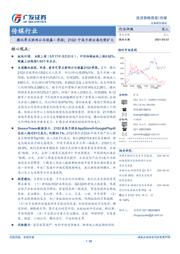 【广发证券】【20210523】20210523-广发证券-传媒行业投资策略周报:腾讯等互联网公司披露一季报;21Q1中国手游出海优势扩大-23页