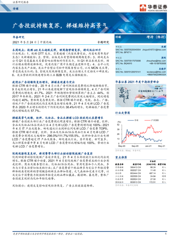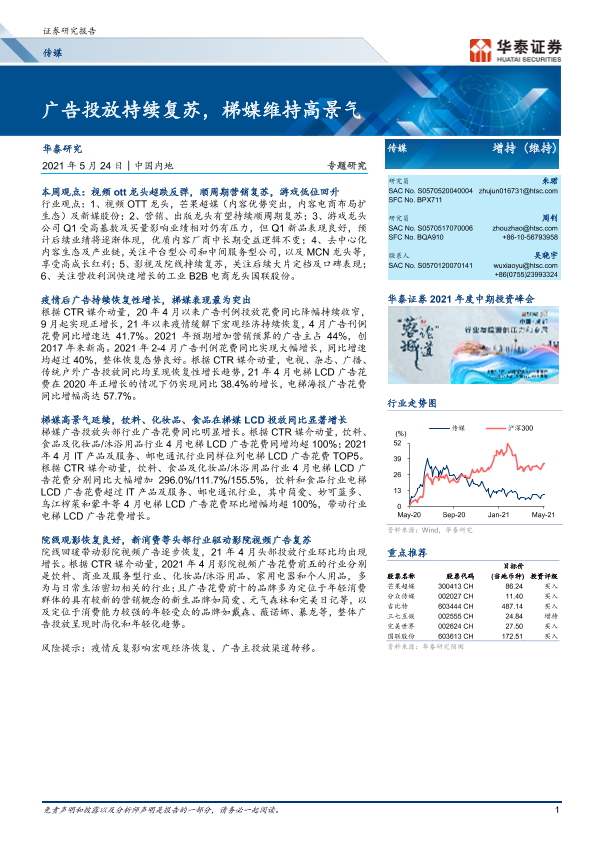 【华泰证券】【20210524】20210524-华泰证券-传媒专题研究:广告投放持续复苏,梯媒维持高景气-13页