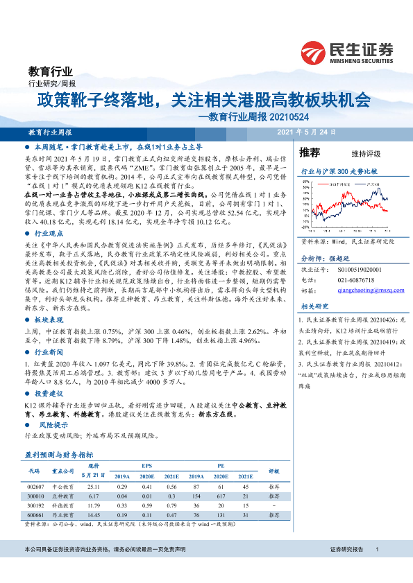 【民生证券】【20210524】20210524-民生证券-教育行业周报:政策靴子终落地,关注相关港股高教板块机会-12页