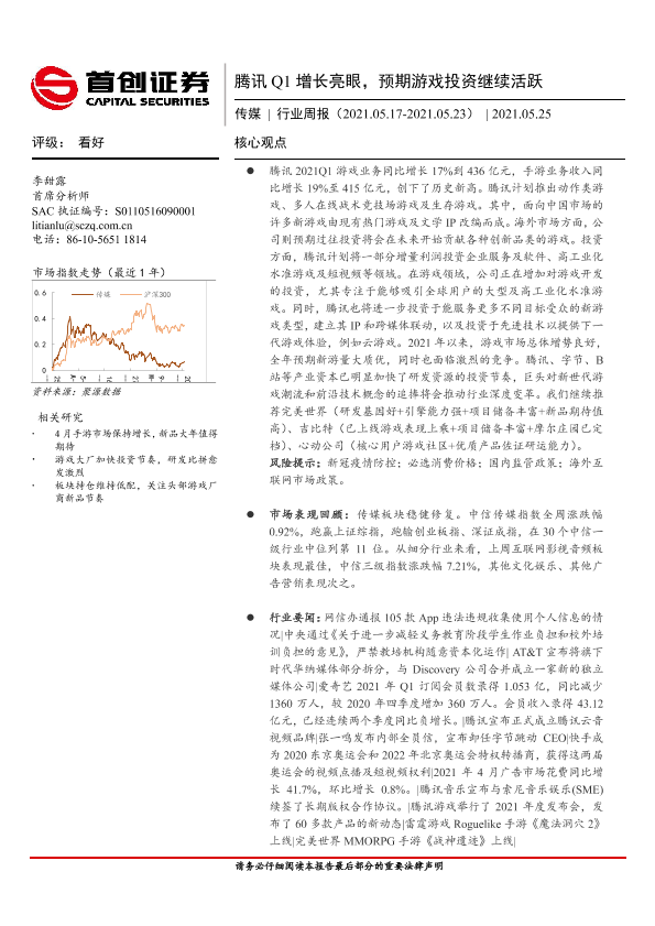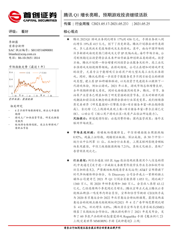 【首创证券】【20210525】20210525-首创证券-传媒行业周报:腾讯Q1增长亮眼,预期游戏投资继续活跃-11页
