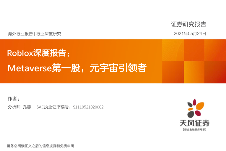 【天风证券】【20210524】Roblox深度报告:Metaverse第一股,元宇宙引领者-53页