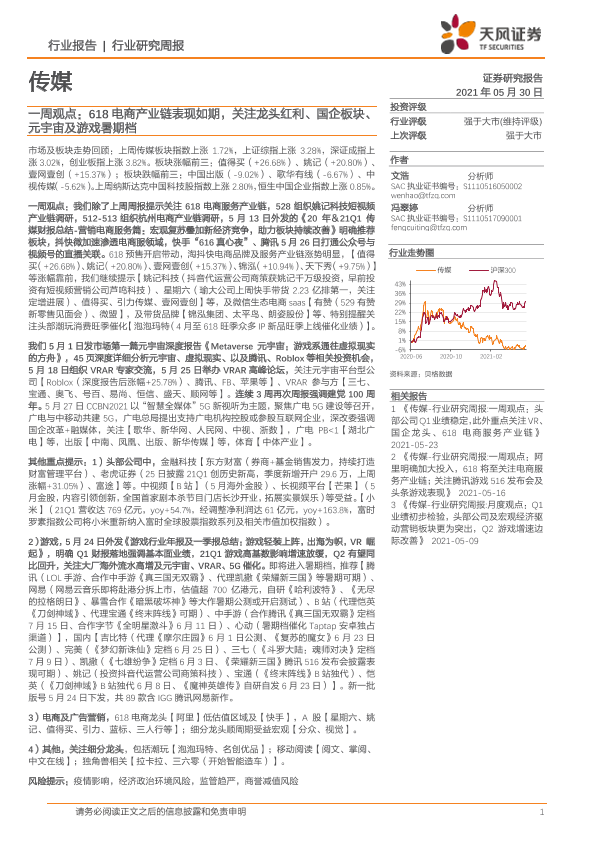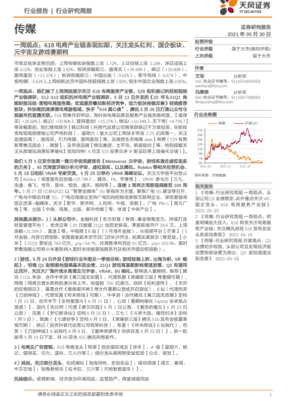 【天风证券】【20210530】传媒一周观点:618电商产业链表现如期,关注龙头红利、国企板块、元宇宙及游戏暑期档-17页