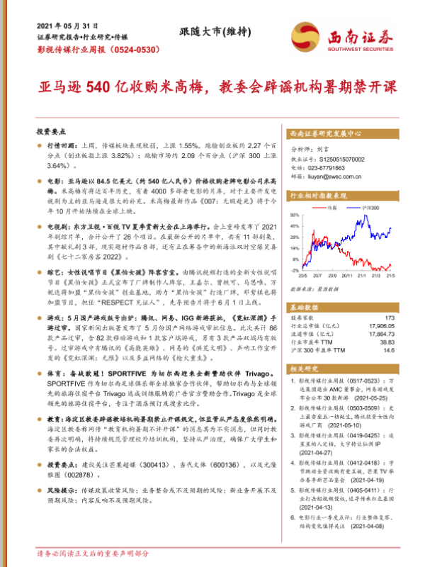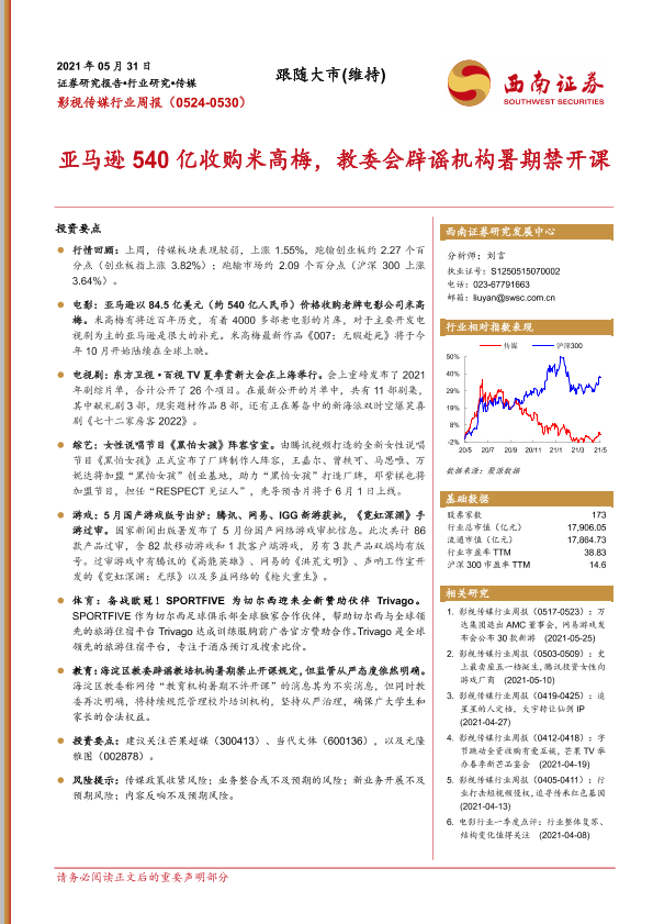 【西南证券】【20210531】20210531-西南证券-影视传媒行业周报:亚马逊540亿收购米高梅,教委会辟谣机构暑期禁开课-19页