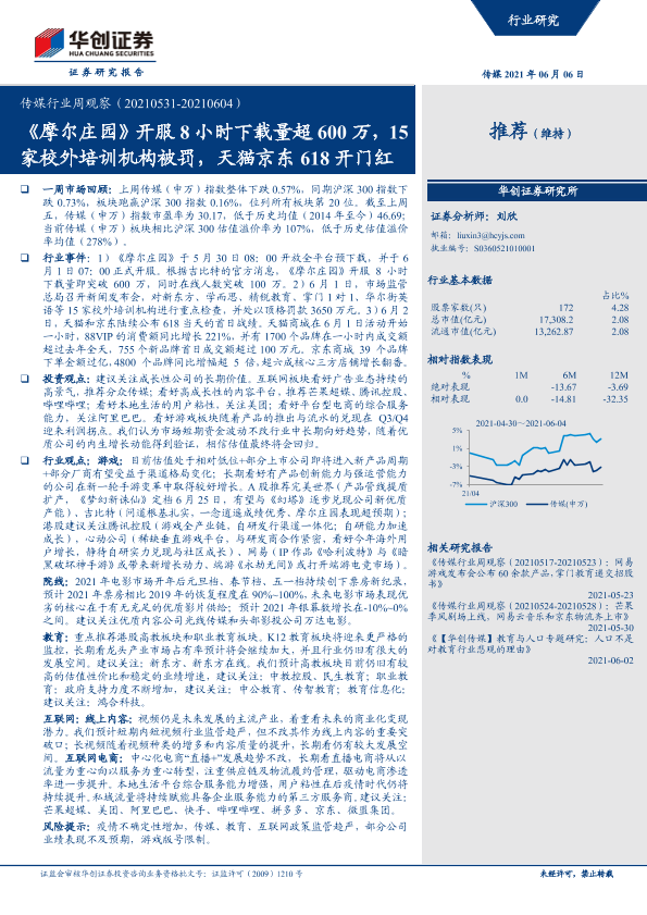 【华创证券】【20210606】传媒行业周观察:《摩尔庄园》开服8小时下载量超600万,15家校外培训机构被罚,天猫京东618开门红-22页