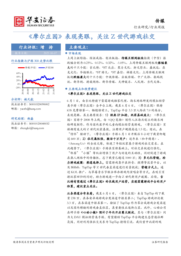【华安证券】【20210607】20210606-华安证券-传媒行业周报:《摩尔庄园》表现亮眼,关注Z世代游戏社交-18页