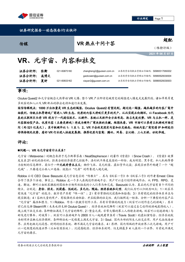【国信证券】【20210607】VR热点十问十答:VR、元宇宙、内容和社交-9页