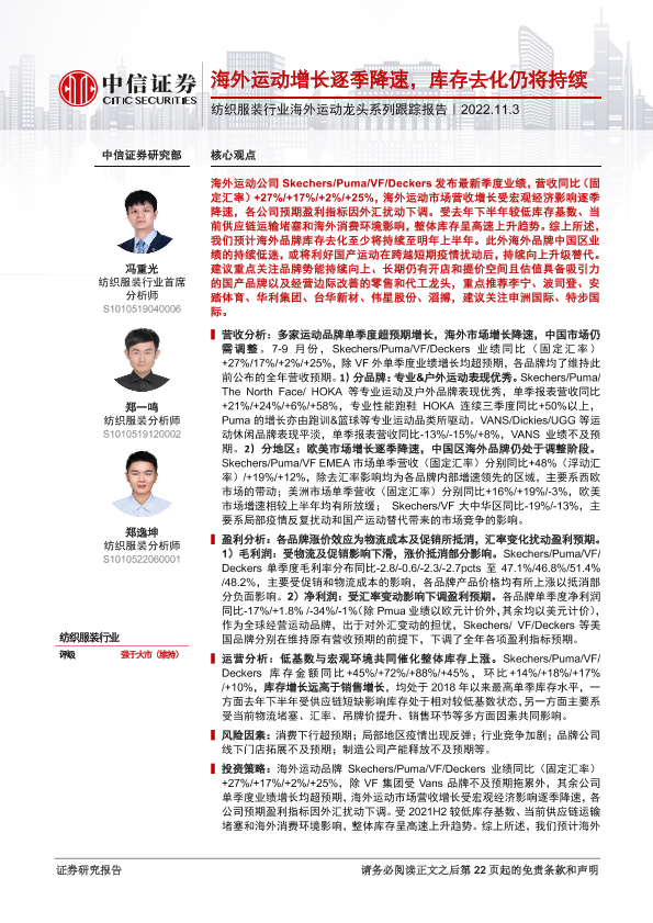 【中信证券】【20221103】纺织服装行业海外运动龙头系列跟踪报告:海外运动增长逐季降速,库存去化仍将持续-23页