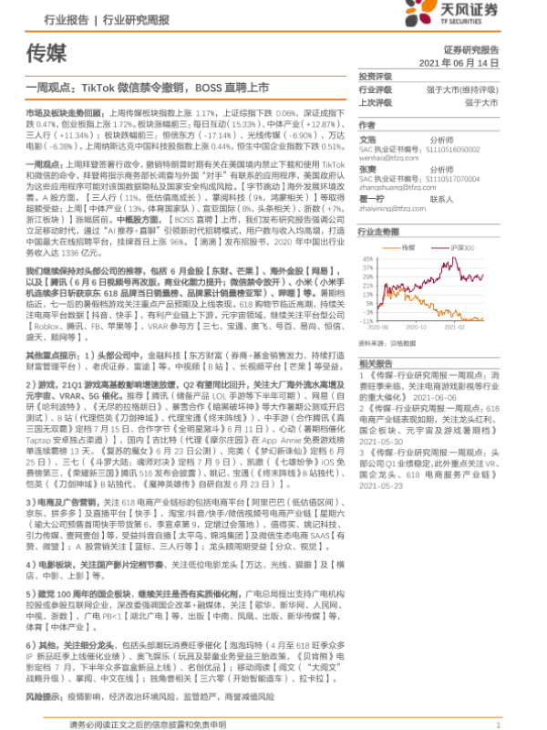 【天风证券】【20210614】传媒一周观点:TikTok微信禁令撤销,BOSS直聘上市-16页
