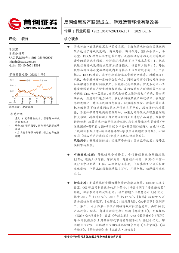 【首创证券】【20210616】20210616-首创证券-传媒行业周报:反网络黑灰产联盟成立,游戏运营环境有望改善-11页