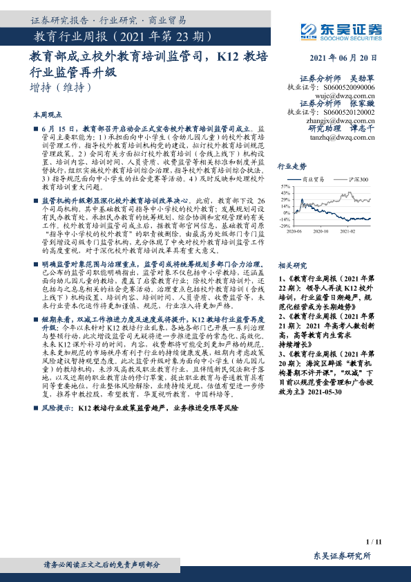 【东吴证券】【20210620】教育行业周报(2021年第23期):教育部成立校外教育培训监管司,K12教培行业监管再升级-11页