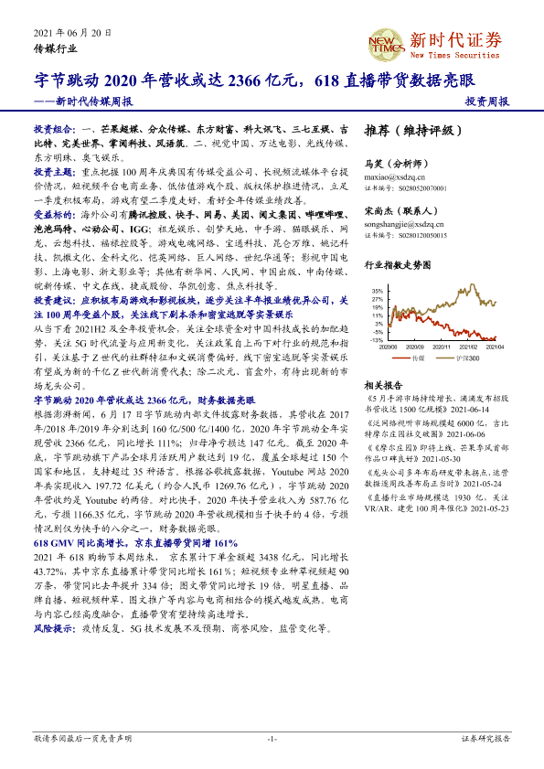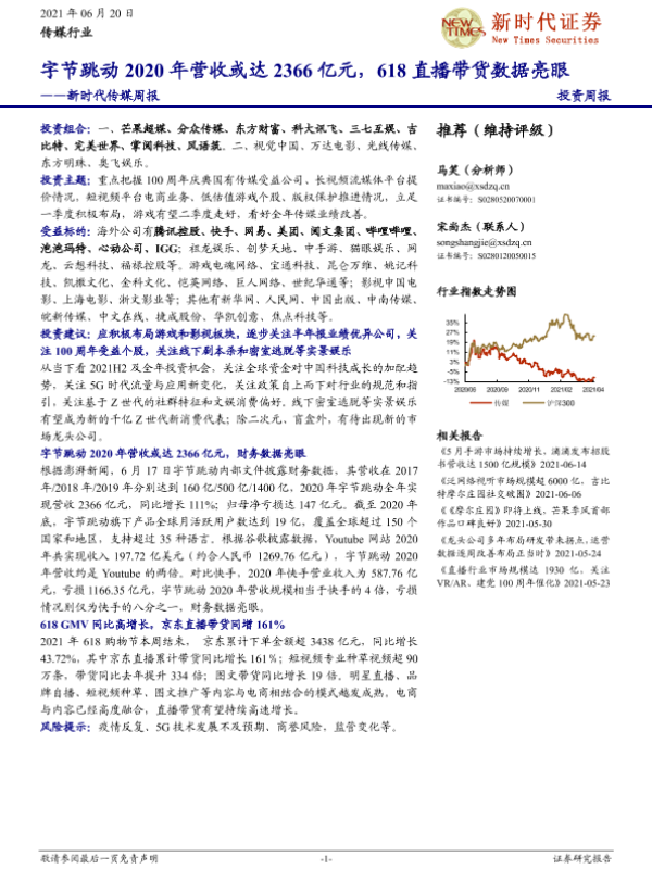 【新时代证券】【20210620】新时代证券-新时代传媒周报:字节跳动2020年营收或达2366亿元,618直播带货数据亮眼-24页