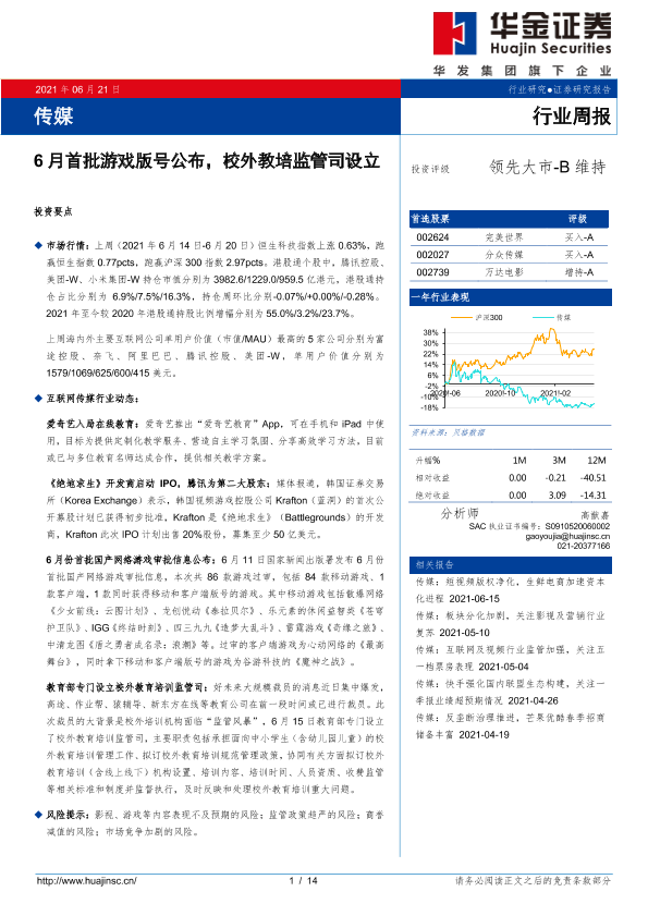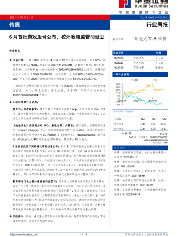 【华金证券】【20210621】20210621-华金证券-传媒行业周报:6月首批游戏版号公布,校外教培监管司设立-14页