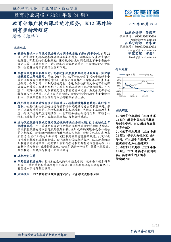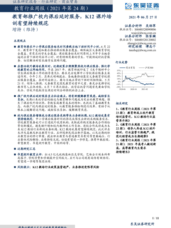 【东吴证券】【20210627】教育行业周报(2021年第24期):教育部推广校内课后延时服务,K12课外培训有望持续规范-11页