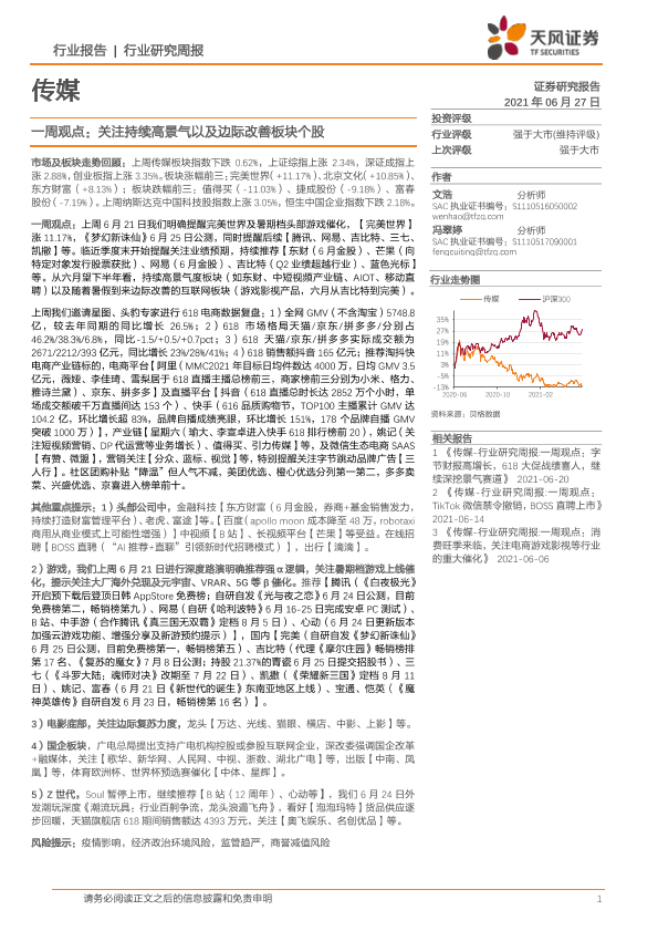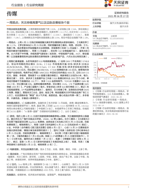 【天风证券】【20210627】20210627-天风证券-传媒一周观点:关注持续高景气以及边际改善板块个股-16页