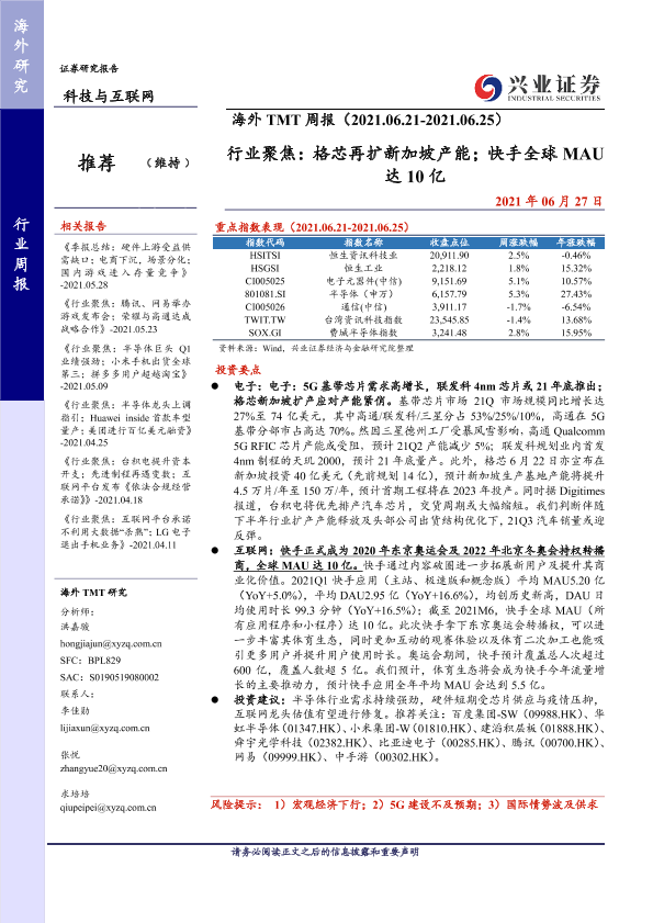 【兴业证券】【20210627】行业聚焦:格芯再扩新加坡产能;快手全球MAU达10亿-20页