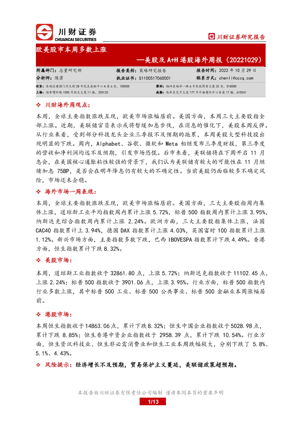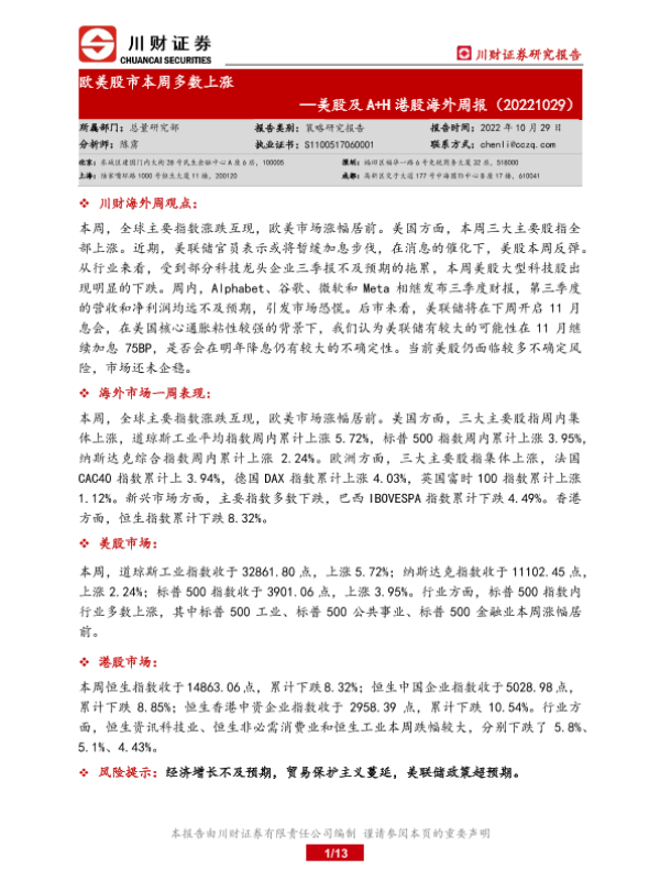【川财证券】【20221029】美股及A+H港股海外周报:欧美股市本周多数上涨-13页