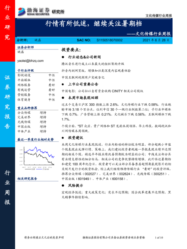 【渤海证券】【20210628】20210628-渤海证券-文化传媒行业周报:行情有所低迷,继续关注暑期档-10页