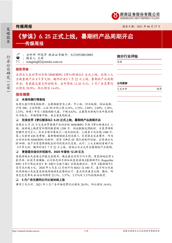 【浙商证券】【20210627】20210627-浙商证券-传媒周报:《梦诛》6.25正式上线,暑期档产品周期开启-18页