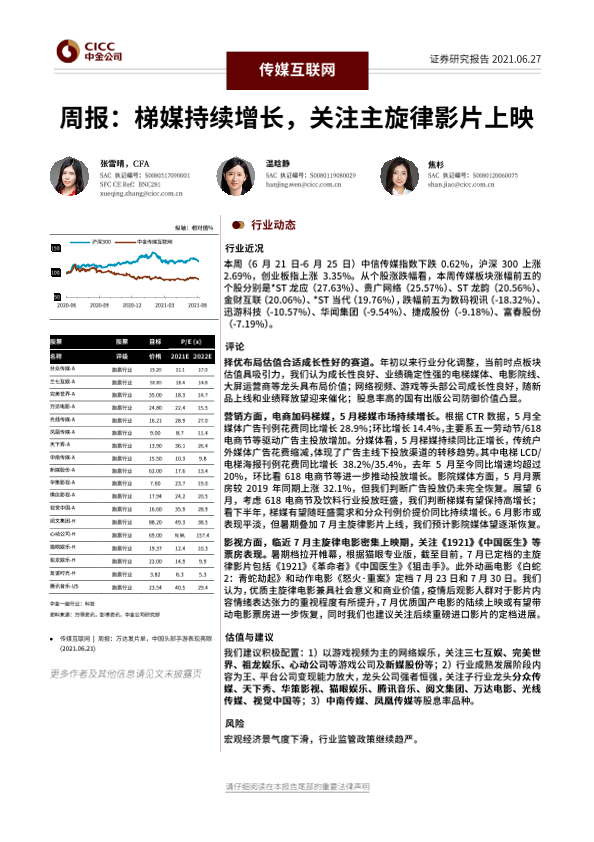 【中金公司】【20210627】传媒互联网行业周报:梯媒持续增长,关注主旋律影片上映-26页