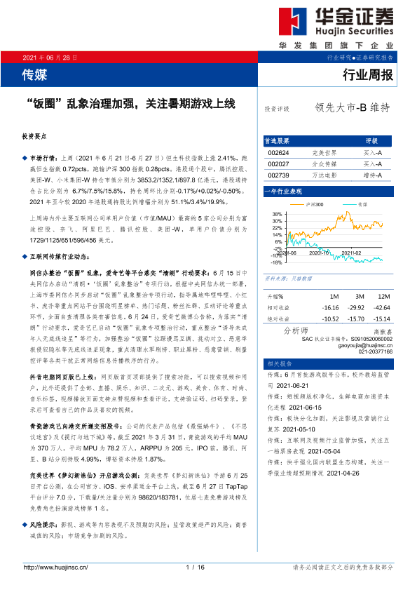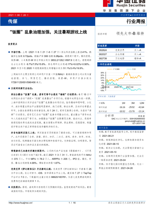 【华金证券】【20210628】20210628-华金证券-传媒行业周报:“饭圈”乱象治理加强,关注暑期游戏上线-16页