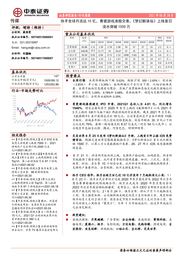 【中泰证券】【20210628】20210628-中泰证券-传媒行业周报:快手全球月活达10亿,青瓷游戏港股交表,《梦幻新诛仙》上线首日流水突破1500万-11页