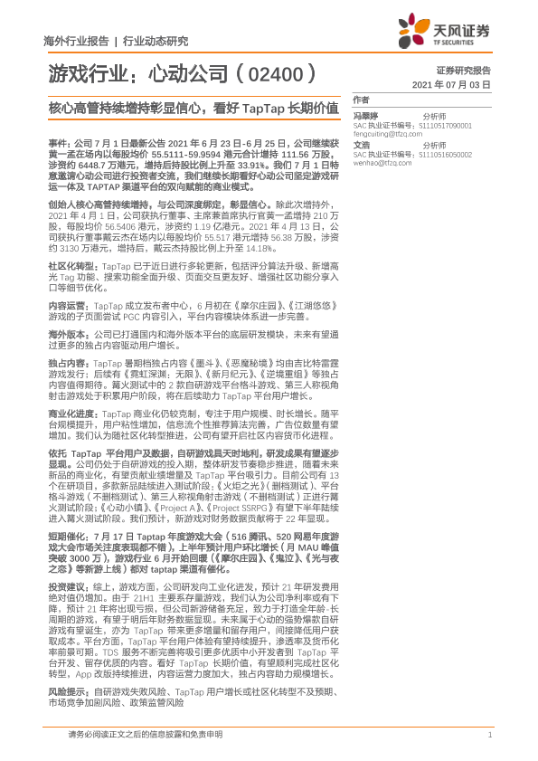 【天风证券】【20210703】游戏行业:心动公司:核心高管持续增彰显信,看好TapTap长期价值-2页