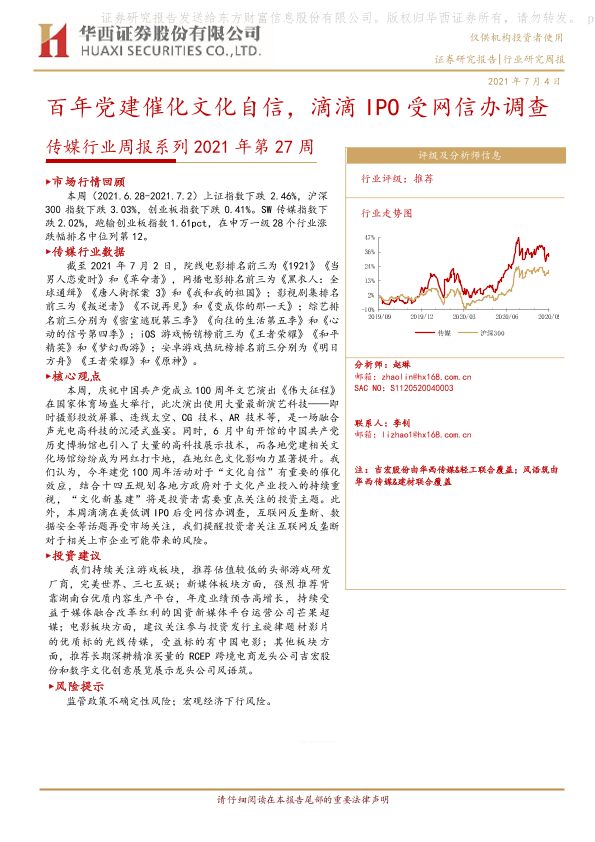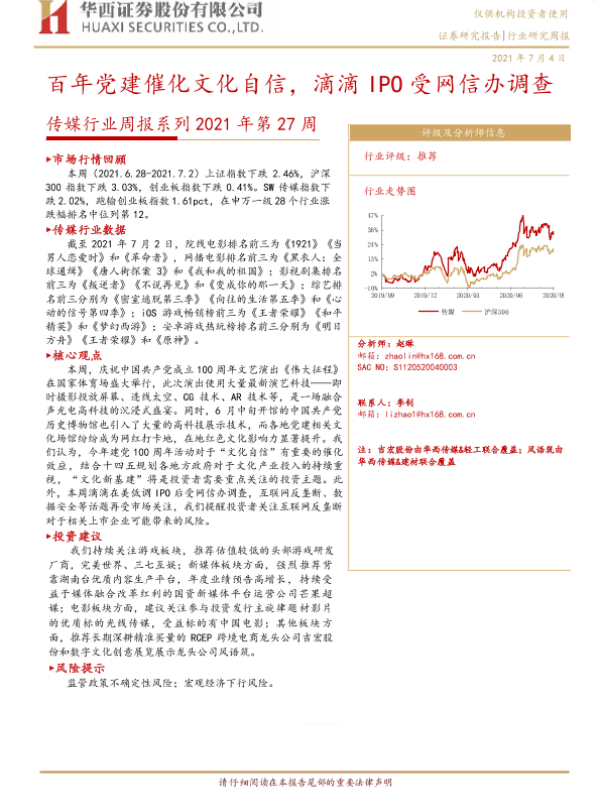 【华西证券】【20210704】20210704-华西证券-传媒行业周报系列2021年第27周:百年党建催化文化自信,滴滴IPO受网信办调查-15页