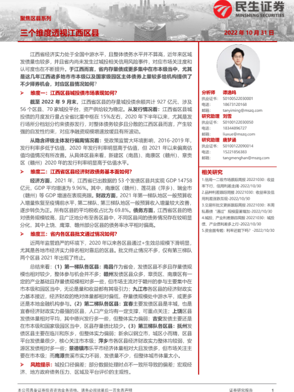 债务基本面 城投债 市场表现 江西区县 经济财政
