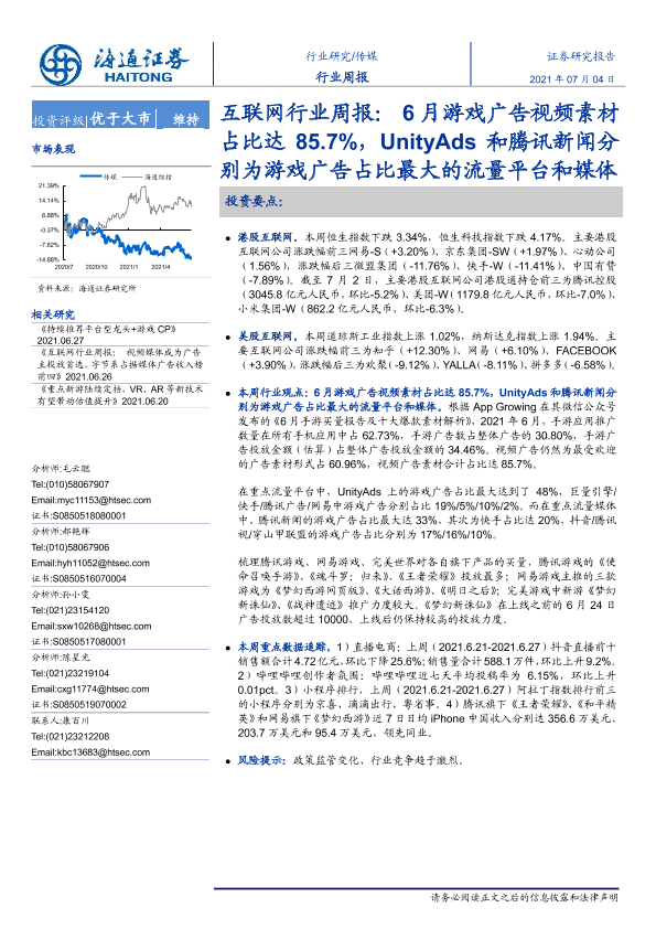 【海通证券】【20210704】互联网行业周报:6月游戏广告视频素材占比达85.7%,UnityAds和腾讯新闻分别为游戏广告占比最大的流量平台和媒体-9页