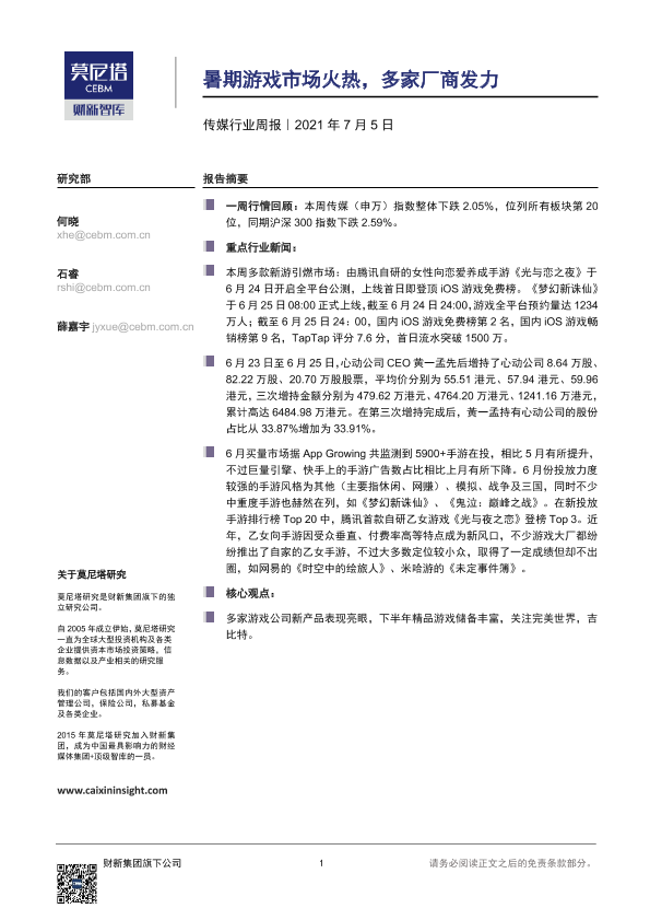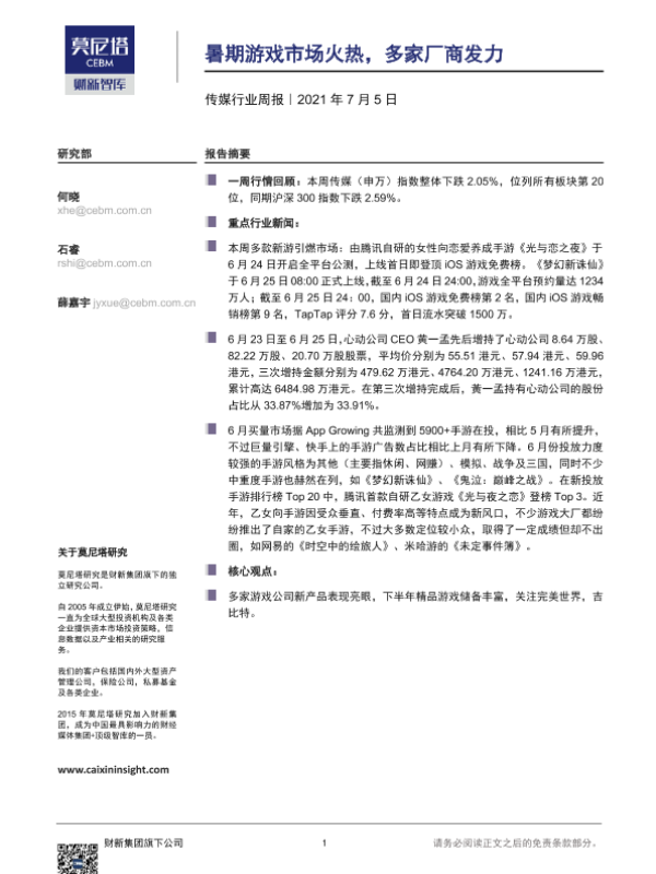 【莫尼塔研究】【20210705】20210705-莫尼塔投资-传媒行业周报:暑期游戏市场火热,多家厂商发力-8页