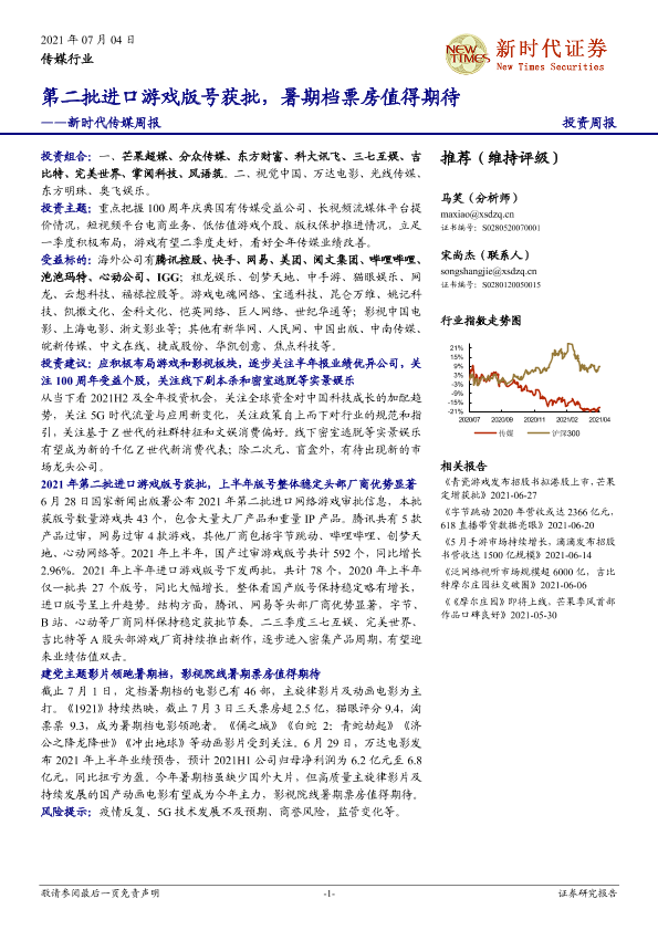 【新时代证券】【20210704】新时代传媒周报:第二批进口游戏版号获批,暑期档票房值得期待-17页