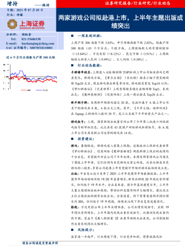 【上海证券】【20210705】两家游戏公司拟赴港上市,上半年主题出版成绩突出-10页