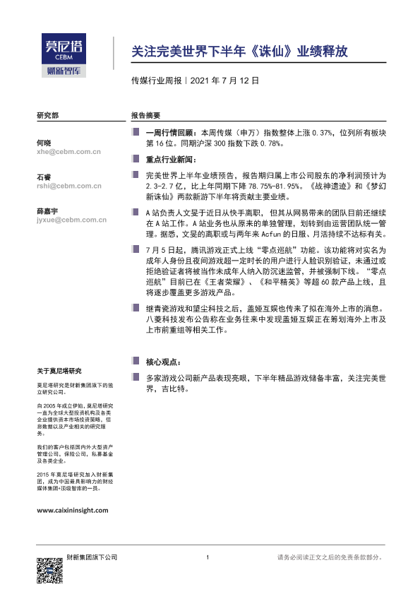 【莫尼塔研究】【20210712】20210712-莫尼塔投资-传媒行业周报:关注完美世界下半年《诛仙》业绩释放-8页