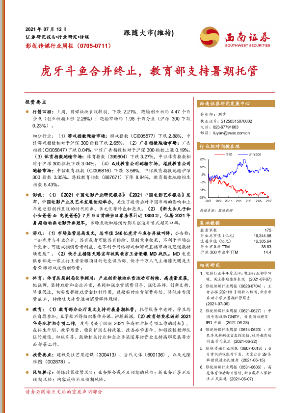 【西南证券】【20210712】20210712-西南证券-影视传媒行业周报:虎牙斗鱼合并终止,教育部支持暑期托管-17页