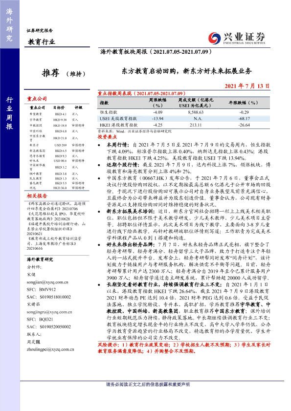 【兴业证券】【20210713】海外教育板块周报:东方教育启动回购,新东方好未来拓展业务-10页