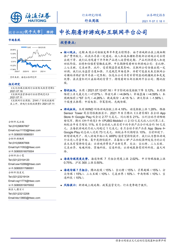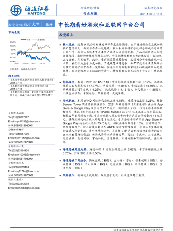 【海通证券】【20210718】20210718-海通证券-传媒行业周报:中长期看好游戏和互联网平台公司-10页