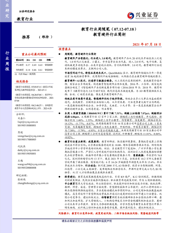 【兴业证券】【20210718】教育行业周随笔(07.12-07.18) 教育硬件行业简析-19页