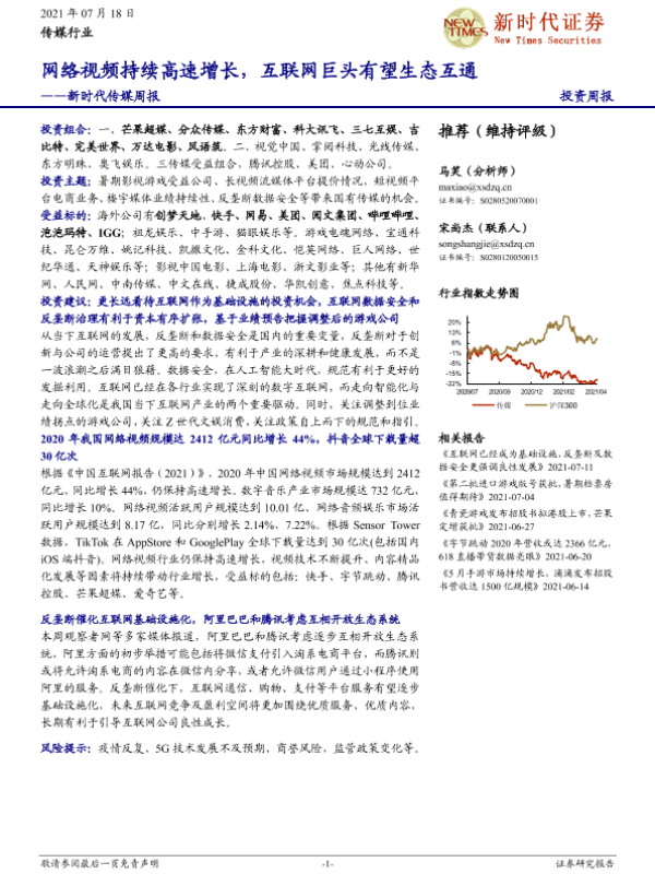 【新时代证券】【20210718】新时代传媒周报:网络视频持续高速增长,互联网巨头有望生态互通-18页