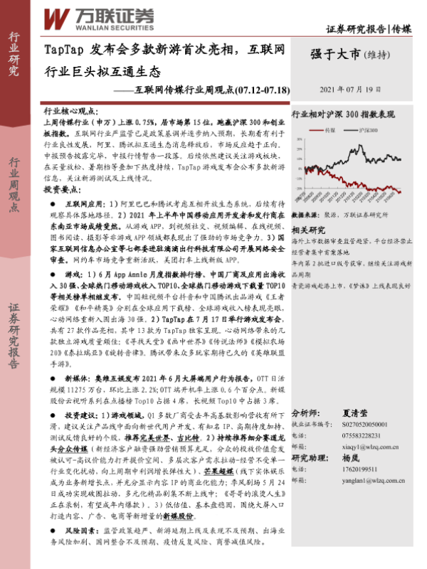【万联证券】【20210719】20210719-万联证券-互联网传媒行业周观点:TapTap发布会多款新游首次亮相,互联网行业巨头拟互通生态-21页