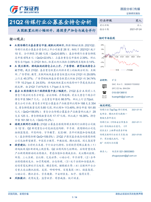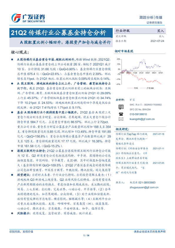 【广发证券】【20210724】21Q2传媒行业公募基金持仓分析:A股配置比例小幅回升,港股资产加仓与减仓并行-14页
